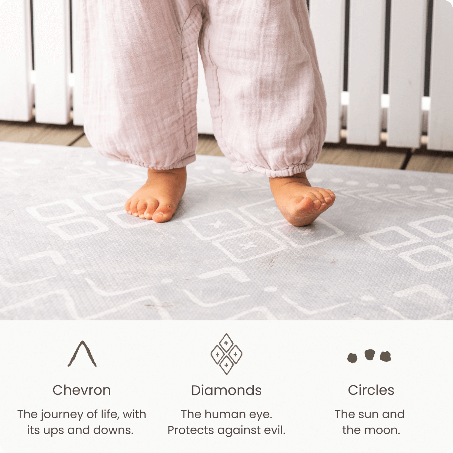 It all began with our first design, the Classic Gray playmat. Inspired by the 1,200-year-old artistry of Morocan Berber rugs and minimalist Scandinavian design, this playmat tells a refined story with hand-illustrated motifs: diamonds for protection and chevrons representing life's journey with its ups and downs. Rooted in Moroccan traditions of a rug's role of infusing homes with positive energy, our Classic Gray playmat set the standard for our designs.