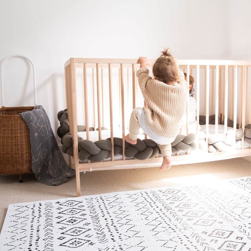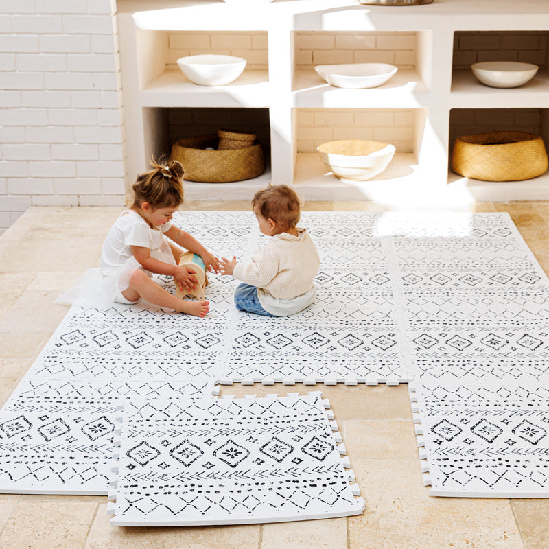 Elevate your home décor with our Boho Playmat. Featuring striking Bohemian patterns and a chic monochrome palette, this playmat brings contemporary elegance to any space, while providing a safe, and easy-to-clean area for your little one to play and explore.