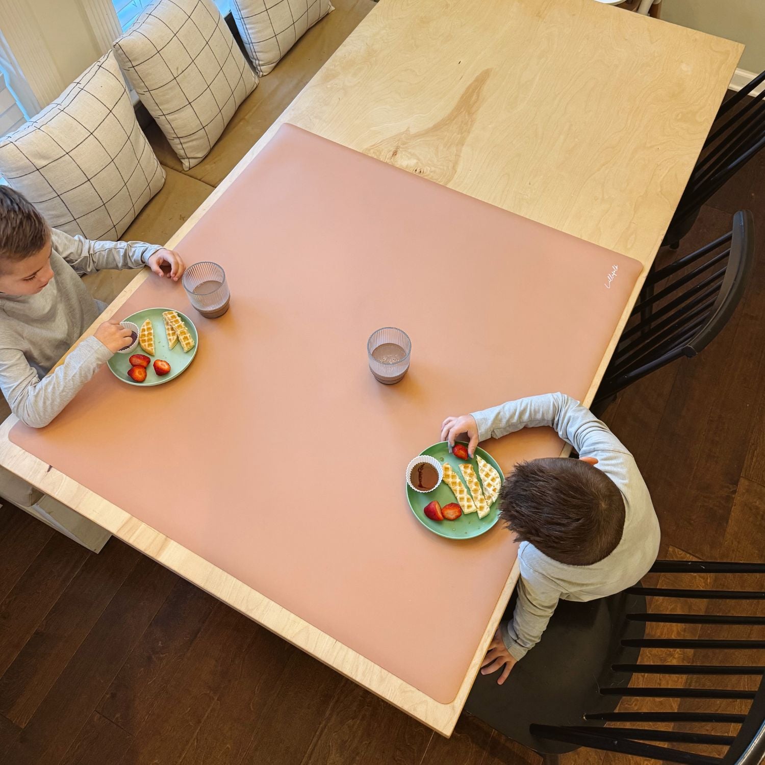 The Everyday Mat stays firmly in place thanks to its rubber backing, lays completely flat and doesn’t crease. It’s generously sized to cover the width of most family tables to capture ALL the mess. It is water proof and wipes clean. Plus, it looks beautiful in your home.