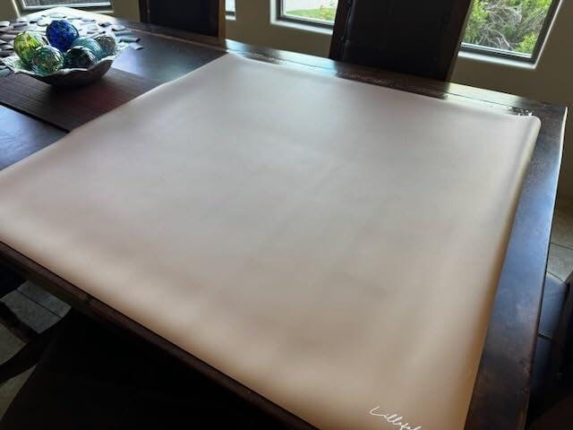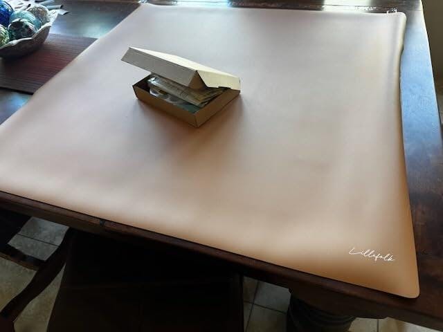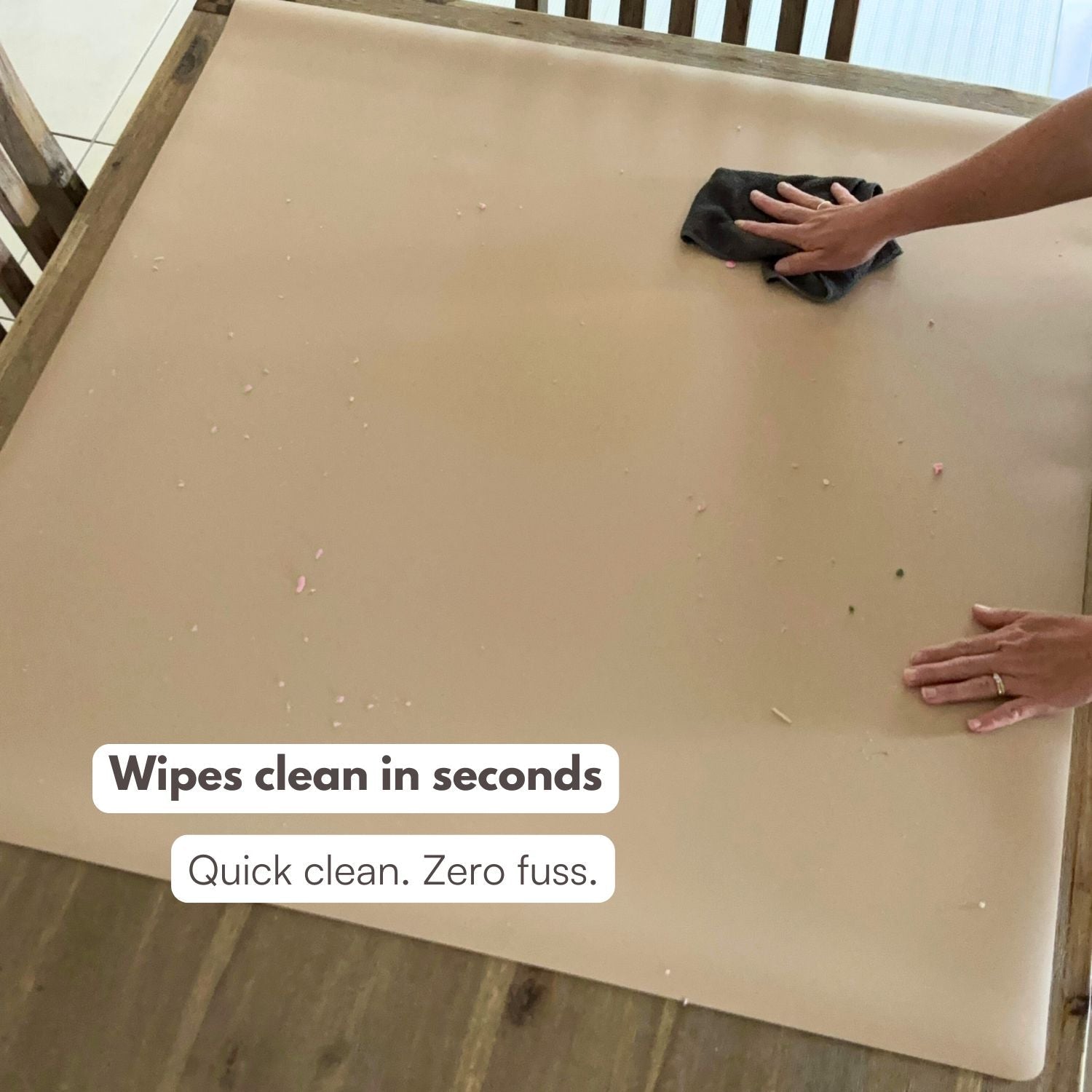 It’s a generous 38” x 39.4” (96.5cm x 100cm). Big enough to cover the messy zone, but not so big it takes over your table. It’s easy to roll up and tuck away when you’re done, or you can leave it out, whatever suits your space.