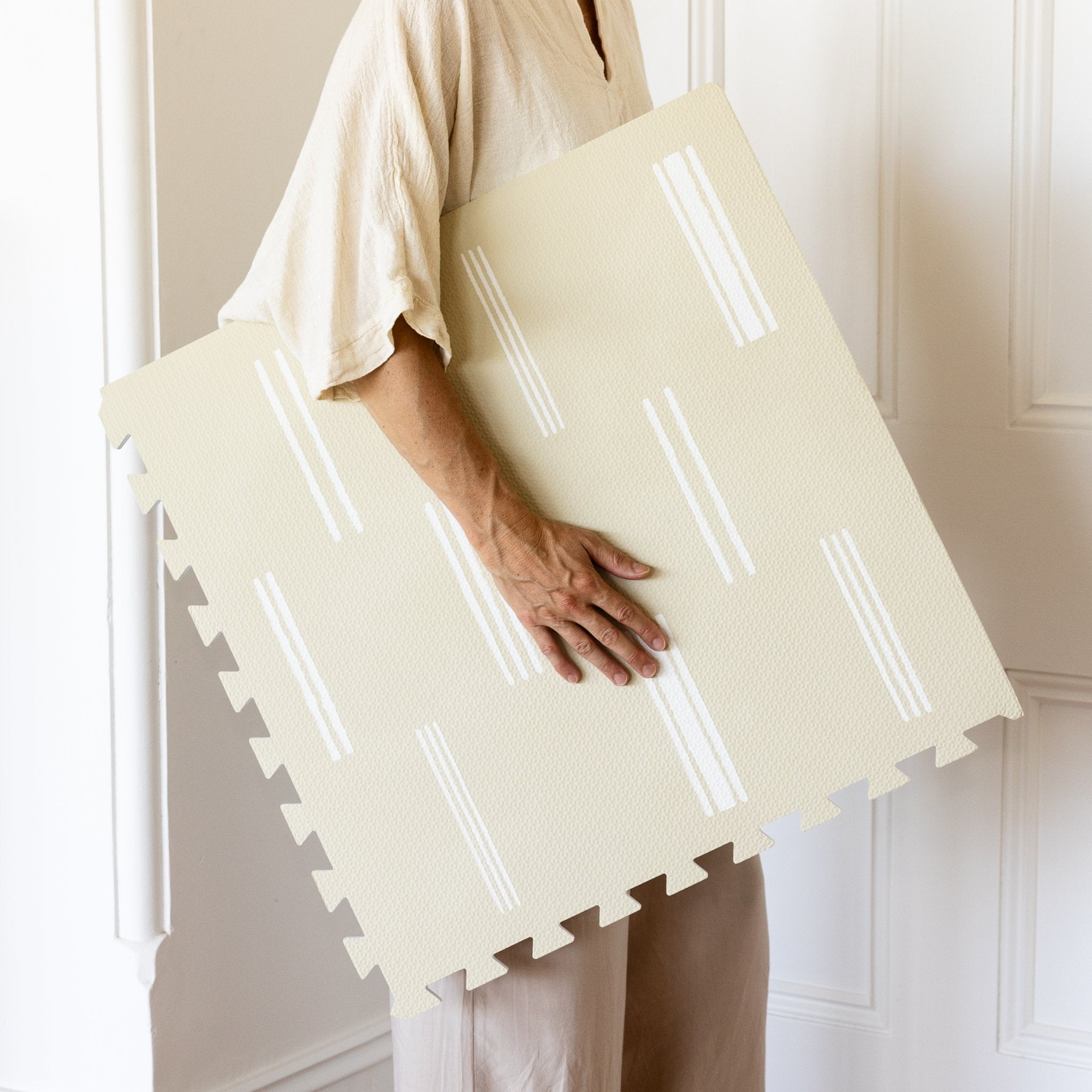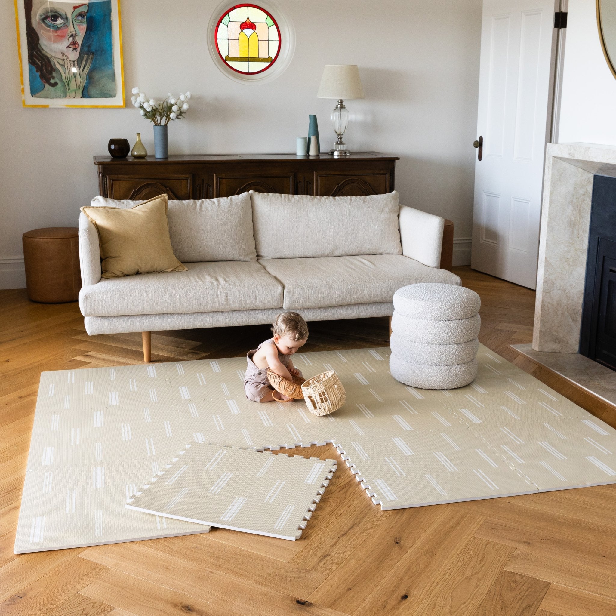 With clean lines and soft, sandy tones, this playmat brings a modern, understated aesthetic to your home. The hand-drawn striped design adds just the right amount of texture, while the cushioned surface ensures comfort through playtime, tummy time, and beyond.