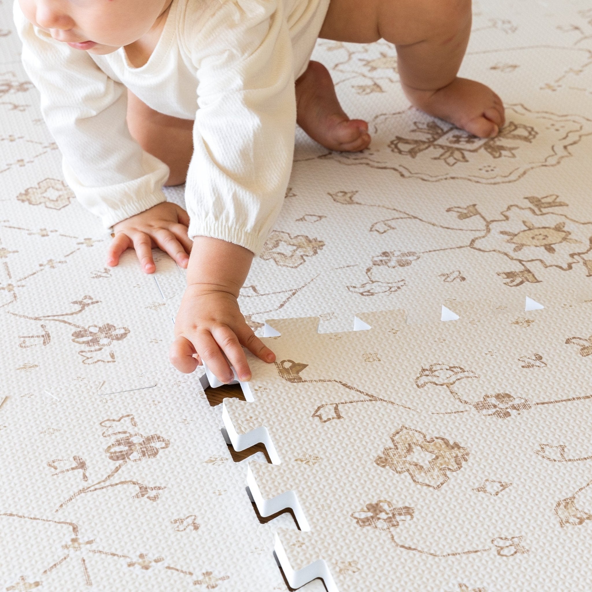 Our Vintage Playmat brings effortless style to your space with soft, washed grays and intricate hand-drawn patterns inspired by timeless rugs. The muted tones complement any décor—vintage, modern, or somewhere in between. Designed for comfort and built for play, it’s ultra-soft, supportive, and perfect for tummy time, first steps, and everyday moments.