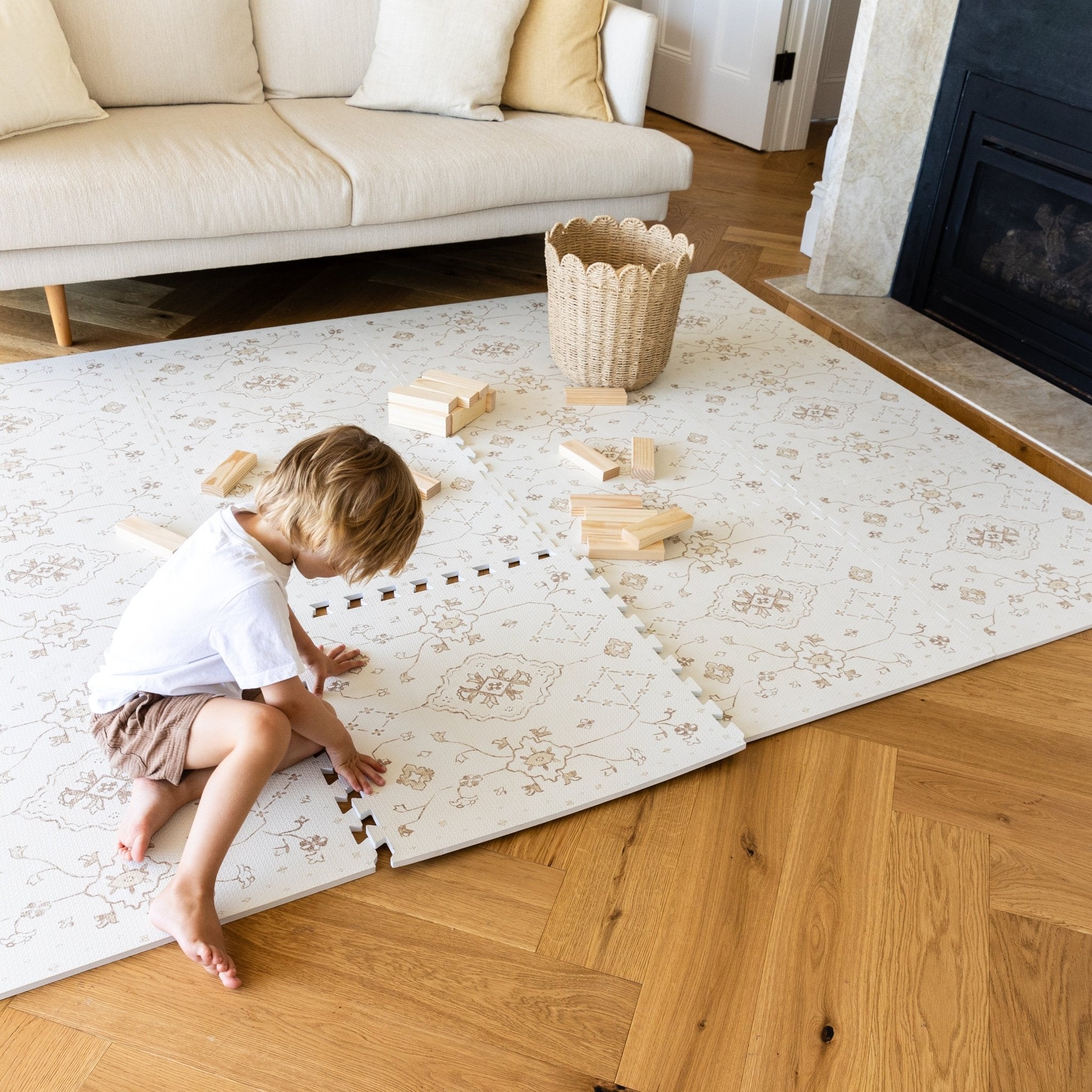 Lillefolk play mats blend Swedish minimalism, neutral tones, and traditional rug motifs to fit beautifully into your home.
